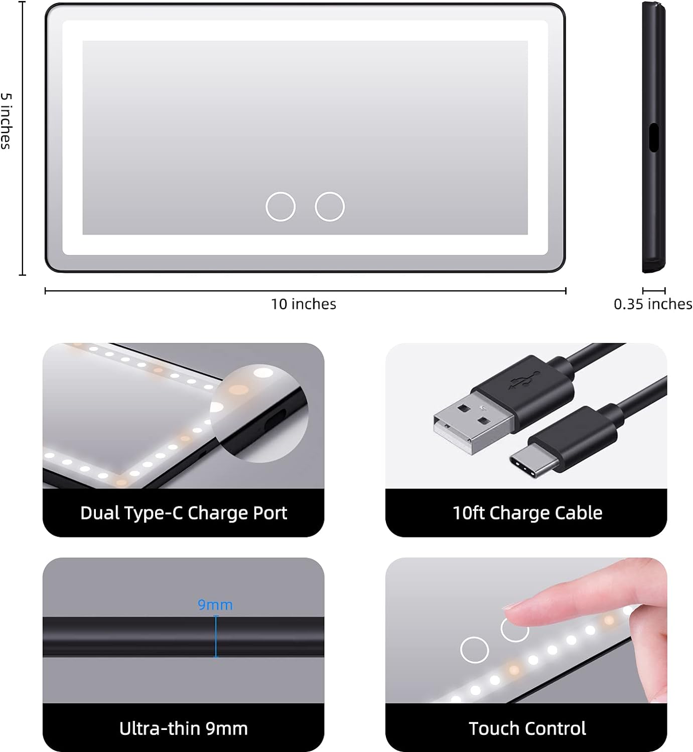 USB RECHARGEABLE - Built-in 2000 mAh lithium battery, which can be charged by car, socket, computer, mobile power, free to use the vanity mirror at anywhere and anytime. It can last 8 hours if 100% brightness while always On mode.